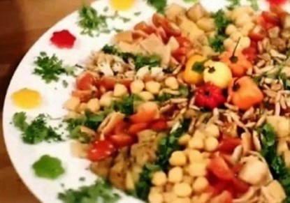 - وزّعي الحمص على الخضروات وأنثري الكزبرة والصنوبر وقدميها.